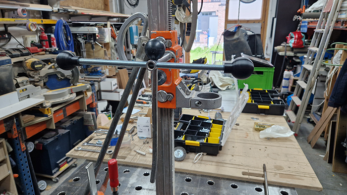 Professionele klant met een ouder model klokboor statief vroeg ons om enkele aanpassingen te doen om de functionaliteit te verbeteren: -insijpelen vuil/water in verstelvoetjes - 2e hendel - versteviging bevestiging in het midden
