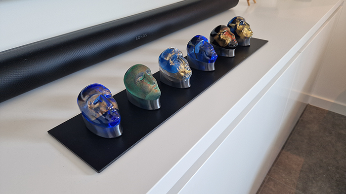 Ontwerpen van kraagjes om de hoofdjes mooi toonbaar op een display te zetten. Verschillende prototypes gemaakt tot ze mooi tot hun recht kwamen. Kraagjes in vaasvorm geprint met semi transparant materiaal waardoor de achterhoofdjes nog steeds licht zichtbaar zijn. Gemonteerd op een stalen plaat op maat met magneten.