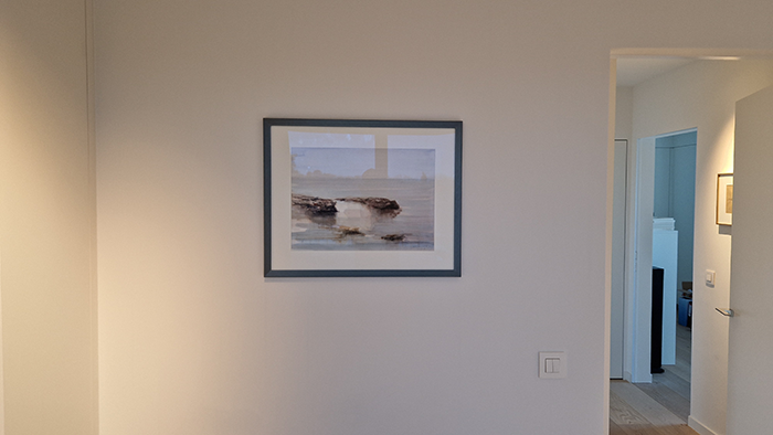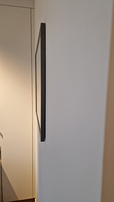 Ontwerp van een ronde ophanging die de kabel en daardoor ook de kader vanzelf tegen de muur trekt. Door de ronde vorm kan er nog links en rechts verschoven worden. Het ontwerp heef enkel een vijs en plug nodig, dus geen gedoe meer met haken.